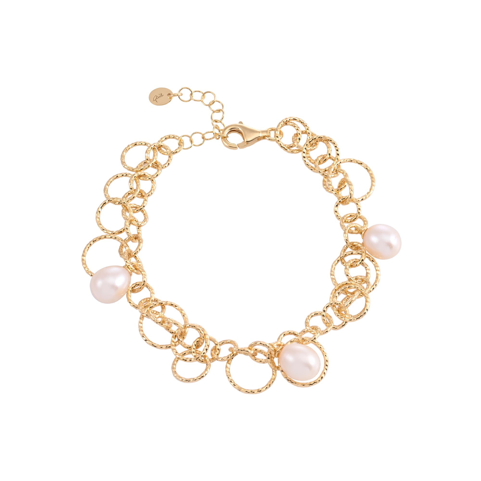 Sterling Silver bracelet with yellow gold plating and a shiny, diamond-cut finish, featuring multiple round rings of different sizes and teardrop-shaped freshwater pearls. An original and elegant bracelet that is a timeless must-have and will draw attention to your wrist.